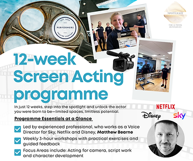 As part of Spotlight: The 12-Week Intensives flagship programme, Performers Theatre Company is proud to present a brand-new Screen Acting Intensive, facilitated by experienced professional Matthew Bearne — Voice Director for leading platforms including Sky, Netflix, and Disney.